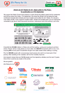 We support the Welsh Government initiative to make 20mph the default speed limit for residential and built-up areas from today, 17th September. We praise the 20mph limit as being the huge contribution towards fairer streets and more liveable communities for all in Wales. It’s not just a road safety benefit. It also supports broader health, climate and societal goals such as helping the vulnerable to get about, improving social connection, reducing air and noise pollution, and more.