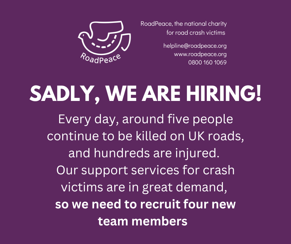 The RoadPeace vision is for a world where road danger is not tolerated, where road crash victims receive justice and compassion and where there is no requirement for RoadPeace to exist. Yet, sadly, this vision seems a long way off. Instead, the charity is recruiting four new team members, to cope with the ongoing support needed for people bereaved and injured in road collisions.